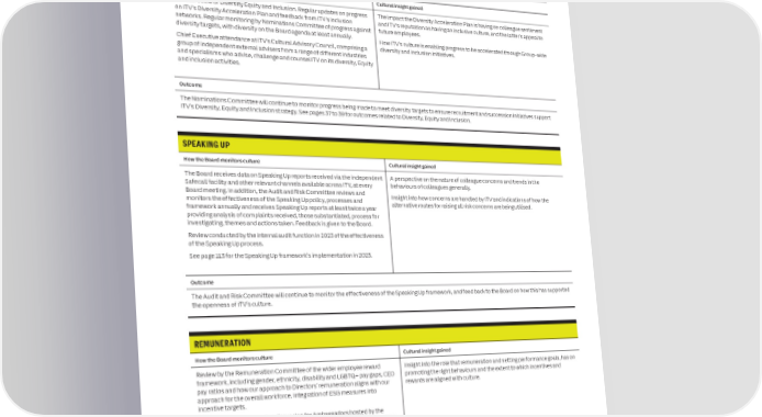 98 ITV plc Annual Report and Accounts 2023 ITV plc Annual Report and Accounts 2023 99 VALUES IN ACTION – UNDERSTANDING AND MONITORING OUR CULTURE CONTINUED G O VE R NAN C RECRUITMENT AND RETENTIONSOCIAL PURPOSE, DIVERSITY EQUITY AND INCLUSION E How the Board monitors cultureCultural insight gainedHow the Board monitors culture Cultural insight gained Annual review session by the Nominations Committee of senior management As well as a review of succession plans, this session also provided the Board Annual review of ITV’s Social Purpose strategy, performance and plans. How ITV’s Social Purpose campaigns influence culture internally as well talent and succession planning led by the Chief Executive.with opportunity to understand how we had delivered the 2023 ITV people as externally. priorities, with focus on our key people processes, as well as how we are managing the people challenges and risks as we lean into our digital Outcome transformation and phase two of the More Than TV strategy.The Board will continue to monitor key priorities and initiatives in pursuit of ITV’s Social Purpose strategy. Outcome How the Board monitors culture Cultural insight gained The session was led by the Chief Executive, with a robust conversation on senior level succession planning as well as enabling the Nominations Committee Annual review of Diversity Equity and Inclusion. Regular updates on progress The impact the Diversity Acceleration Plan is having on colleague sentiment to ask questions and challenge the strength of the succession plans. Additionally, the pre-read provided the Committee with details on the steps taken on ITV’s Diversity Acceleration Plan and feedback from ITV’s inclusion and ITV’s reputation as having an inclusive culture, and the latter’s appeal to to deliver and execute on the 2023 people plan across our key people processes, including: selection and hiring of key talent; performance management; networks. Regular monitoring by Nominations Committee of progress against future employees. learning & development; and engagement. The paper also outlined any areas of risk as it relates to our people, and how this is being mitigated.diversity targets, with diversity on the Board agenda at least annually. How ITV’s culture is enabling progress to be accelerated through Group-wide Chief Executive attendance at ITV’s Cultural Advisory Council, comprising a diversity and inclusion initiatives. group of independent external advisers from a range of different industries and specialisms who advise, challenge and counsel ITV on its diversity, Equity SAFETY, WELLBEING AND MENTAL HEALTHand inclusion activities. How the Board monitors cultureCultural insight gained Review by Audit and Risk Committee of the improvements to the Group’s risk Insight into the safety behaviours across all business areas (international and Outcome management processes and systems that drive health and safety behaviours UK), including the culture of ownership of risk.The Nominations Committee will continue to monitor progress being made to meet diversity targets to ensure recruitment and succession initiatives support in the areas of operational security, business continuity and duty of care. This ITV’s Diversity, Equity and Inclusion strategy. See pages 37 to 39 for outcomes related to Diversity, Equity and Inclusion. includes the systems in place for our stakeholders to identify and raise health and safety issues, including duty of care and Speaking Up concerns. Outcome Through regular Board updates from the Chief Executive and from the Audit and Risk Committee, the Board will continue to ensure the right processes and SPEAKING UP procedures are in place for the safety of our colleagues, suppliers, programme participants and viewers, and that ITV continues to uphold high standards of duty of care. How the Board monitors culture Cultural insight gained How the Board monitors cultureCultural insight gainedThe Board receives data on Speaking Up reports received via the independent A perspective on the nature of colleague concerns and trends in the Safecall facility and other relevant channels available across ITV, at every behaviours of colleagues generally. Audit and Risk Committee review of duty of care updates from the Duty of How the mental wellbeing processes and support for colleagues and Board meeting. In addition, the Audit and Risk Committee reviews and Insight into how concerns are handled by ITV and indications of how the Care Operating Board (also reported to the Board), on the processes and stakeholders continue to enhance ITV’s culture where social inclusion is monitors the effectiveness of the Speaking Up policy, processes and alternative routes for raising all risk concerns are being utilised. standards in place for colleague and other relevant stakeholder’s wellbeing. embraced and mental health issues are understood, accepted and framework annually and receives Speaking Up reports at least twice a year Feedback from the Ambassador and Network groups, and Mental Health safeguarded.providing analysis of complaints received, those substantiated, process for Advisory Group (external experts), included guidance and support on ITV’s investigating, themes and actions taken. Feedback is given to the Board. approach to mental health and wellbeing with colleagues, production teams, Review conducted by the internal audit function in 2023 of the effectiveness participants in our programmes and viewers.of the Speaking Up process. Outcome See page 113 for the Speaking Up framework’s implementation in 2023. The Board, through the Chief Executive and Duty of Care Operating Board continues to regularly monitor colleague wellbeing (including mental health) and the efficacy of initiatives on culture. The Audit and Risk Committee Chair attends all Duty of Care Operating Board meetings, on behalf of the Board, providing Board oversight, challenge and support and enabling direct feedback to the Boar