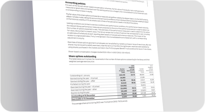 222 ITV plc Annual Report and Accounts 2023 ITV plc Annual Report and Accounts 2023 223 F I NOTES TO THE FINANCIAL STATEMENTS NAN SECTION 4: CAPITAL STRUCTURE AND FINANCING COSTS CONTINUED C I AL 4.7 Keeping This section explains material movements recorded in shareholders’ equity, 4.8 Keeping The Group utilises share award schemes as part of its employee remuneration S T it simple presented in the Consolidated Statement of Changes in Equity, which are not it simple packages, and therefore operates a number of share-based compensation A Equity Share-based T explained elsewhere in the financial statements. schemes, namely the Deferred Share Award (DSA), Executive Share Plan (ESP), E compensation M Performance Share Plan (PSP), Long Term Incentive Plan (LTIP) and Save As You E N Earn (SAYE) schemes. The share-based compensation is not pensionable. T Accounting policies S Fair value reserve A transaction will be classed as share-based compensation where the Group Financial assets are stated at fair value, with any gain or loss recognised directly in the fair value reserve in equity, receives services from employees and pays for these in shares or similar equity unless the loss is a permanent impairment, when it is then recorded in the Consolidated Income Statement. instruments. If the Group incurs a liability linked to the price or value of the Group’s shares, this will also fall under a share-based transaction. Dividends Dividends are recognised through equity on the earlier of their approval by the Company’s shareholders or their Accounting policies payment. Dividends are distributed based on the realised distributable reserves (within retained earnings) of ITV plc For each of the Group’s share-based compensation schemes, the fair value of the equity instrument granted is (the Company) and not based on the Group’s retained earnings. measured at grant date and spread over the vesting period via a charge to the Consolidated Income Statement with 4.7.1 Share capital and share premium a corresponding increase in equity. The Group’s share capital at 31 December 2023 of £406 million (2022: £403 million) and share premium of £174 million The fair value of the share options and awards is measured using either market price at grant date or, for the SAYE scheme, (2022: £174 million) is the same as that of ITV plc. Details of this are given in the ITV plc Company financial statements a Black–Scholes model, taking into account the terms and conditions of the individual scheme. Expected volatility is based section of this Annual Report. on the historical volatility of ITV plc shares over a three or five year period, based on the life of the options. 4.7.2 Merger and other reserves Vesting conditions are limited to service conditions and performance conditions. For performance-based schemes, Merger and other reserves at 31 December include the following reserves: the relevant Group performance measures are projected to the end of the performance period in order to determine 2023 2022 the number of options expected to vest. This estimate of the performance measures is used to determine the option £m £m fair value, discounted to present value. The Group revises the number of options that are expected to vest, including Merger reserves 95 95 an estimate of forfeitures at each reporting date based on forecast performance measures. The impact of the Capital reserves 112 112 revision to original estimates, if any, is recognised in the Consolidated Income Statement, with a corresponding Capital redemption reserves 36 36 adjustment to equity. Revaluation reserves 2 2 Exercises of share options granted to employees can be satisfied by market purchase or issue of new shares. No new Put option liabilities arising on acquisition of subsidiaries (34) (34) shares may be issued to satisfy exercises under the terms of the DSA. During the year, exercises were satisfied by Total 211 211 using shares purchased in the market and held in the ITV Employees’ Benefit Trust as well as the issue of new shares. Merger reserves, Capital reserves and Capital redemption reserves relate primarily to balances arising on previous Share-based compensation charges totalled £16 million in 2023 (2022: £19 million). mergers and acquisitions, including the merger of Granada and Carlton in 2003. Put option liabilities arising on Share options outstanding acquisition of subsidiaries relates to options and forwards contracts over shares relating to non-controlling interests. The table below summarises the movements in the number of share options outstanding for the Group and their 4.7.3 Translation reserve weighted average exercise price: The translation reserve comprises: • All foreign exchange differences arising on the translation of the accounts of, and investments in, foreign operations 2023 2022 • The gains or losses on the portion of cash flow hedges that have been deemed effective and costs of hedging Weighted Weighted Number average Number average under IFRS 9 (see note 4.3) of options exercise price of options exercise price • The net movement in the cash flow hedge reserve was a gain of £5 million (2022: loss of £1 million). This is made (‘000) (pence) (‘000) (pence) up of a gain on cash flow hedges in the year of £6 million (2022: loss of £2 million) and a related tax charge of Outstanding at 1 January 104,729 24.74 98,934 24.98 £1 million (2022: credit of £1 million) Granted during the year – nil priced 20,993 – 17,238 – • The net movement in the cost of hedging reserve was a gain of £4 million (2022: £nil). This is made up of a gain on Granted during the year – other 16,395 59.21 13,814 62.85 the cost of hedging in the year of £6 million (2022: £nil) and a related tax charge of £2 million (2022: £nil) Forfeited during the year (4,210) 68.61 (3,095) 56.49 4.7.4 Fair value reserve Exercised during the year – nil priced (15,551) – (6,201) – The fair value reserve comprise