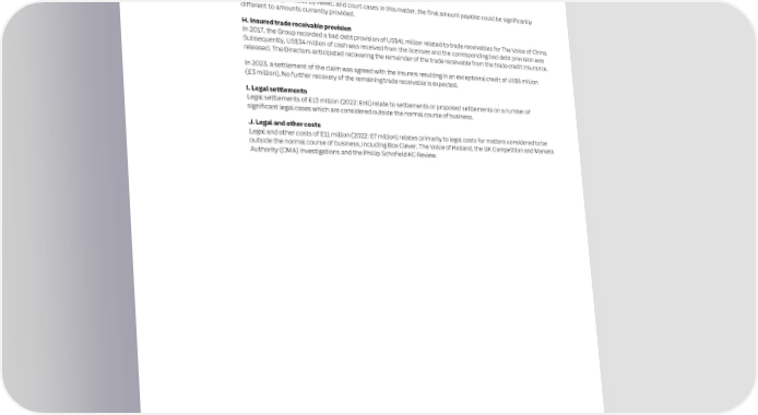 172 ITV plc Annual Report and Accounts 2023 ITV plc Annual Report and Accounts 2023 173 F I NOTES TO THE FINANCIAL STATEMENTS NAN SECTION 2: RESULTS FOR THE YEAR CONTINUED C I AL 2.2 Exceptional Keeping Exceptional items are excluded from management’s assessment of profit because G. Employee-related tax provisions S T it simple by their size or nature they could distort the Group’s underlying quality of earnings. From April 2021 the responsibility for undertaking IR35 employment status assessments, and where necessary A items T They are typically gains or losses arising from events that are not considered withholding PAYE and paying NICs, passed to the employer, rather than remaining with individuals and their personal E M part of the core operations of the business. These items are excluded to reflect service companies. HMRC have issued assessments on the Group for several individuals engaged by the Group E N performance in a consistent manner and are in line with how the business is during the tax years 2016/17 to 2018/19 as employed for tax purposes. This is a complex area and the Group has T managed and measured on a day-to-day basis. been in continuous discussion with HMRC on this matter throughout 2023. S In 2023, HMRC advised that certain individuals were no longer of interest to them and the related provision Accounting policies previously classified as exceptional was released. Exceptional items as described above are highlighted on the face of the Consolidated Income Statement. See the Operating and Financial Performance Review on pages 18 to 31 for the detailed explanation of the Group’s use of Due to ongoing reviews by HMRC and court cases in this matter, the final amount payable could be significantly adjusted performance measures. Gains or losses on disposal of non-core assets are also considered exceptional due different to amounts currently provided. to their nature and impact on the Group’s underlying quality of earnings. H. Insured trade receivable provision Exceptional items In 2017, the Group recorded a bad debt provision of US$41 million related to trade receivables for The Voice of China. Operating exceptional items are analysed as follows: Subsequently, US$34 million of cash was received from the licensee and the corresponding bad debt provision was released. The Directors anticipated recovering the remainder of the trade receivable from the trade credit insurance. 2023 2022 (Charge)/credit Ref. £m £m In 2023, a settlement of the claim was agreed with the insurers resulting in an exceptional credit of US$5 million Operating exceptional items: (£3 million). No further recovery of the remaining trade receivable is expected. Acquisition-related expenses A (24) (4) Restructuring and transformation costs B (25) (28) I. Legal settlements Legal settlements of £13 million (2022: £nil) relate to settlements or proposed settlements on a number of Property costs C (10) (24) significant legal cases which are considered outside the normal course of business. Pension related costs D – (4) Costs related to the passing of Her Majesty Queen Elizabeth II E – (16) J. Legal and other costs Sports rights F – 5 Legal and other costs of £11 million (2022: £7 million) relates primarily to legal costs for matters considered to be Employee-related tax provision G 3 (10) outside the normal course of business, including Box Clever, The Voice of Holland, the UK Competition and Markets Insured trade receivable provision H 3 23 Authority (CMA) investigations and the Phillip Schofield KC Review. Legal settlements I (13) – Legal and other costs J (11) (7) Total operating exceptional items (77) (65) Tax on operating exceptional items 12 8 Total operating exceptional items net of tax (65) (57) A. Acquisition-related expenses Acquisition-related expenses of £24 million (2022: £4 million) are predominantly performance-based, employment- linked consideration to former owners and professional fees related to acquisitions and potential acquisitions. B. Restructuring and transformation costs Restructuring and transformation costs of £25 million (2022: £28 million) relate to one-off significant restructuring and transformation programmes of the business. Significant projects include a business transformation programme which commenced in 2021. This programme includes the implementation of a new cloud-based ERP solution, a software as a service (SaaS) solution where the implementation costs are expensed as incurred. The implementation commenced in 2021 and is expected to continue into 2024. Other significant projects include a rationalisation of the Studios operational structures outside the UK. Costs relating to this review will continue throughout 2024. C. Property costs llion) of property costs Following the decision to move to Broadcast Centre in early 2022, £10 million (2022: £17 mi and move related costs have been recognised as exceptional, including accelerated depreciation following a change in useful life of the related assets. No further exceptional costs are expected related to the move to Broadcast Centre. In 2022, an additional £7 million impairment on leasehold improvements and right of use asset was provided following the decision to vacate our New York office and reduce our property footprint in the US. D. Pension related costs The 2022 charge relates to the risk premium paid in relation to the buy-out of Section C of the ITV Pension Scheme. E. Costs related to the passing of Her Majesty Queen Elizabeth II Following the passing of Her Majesty Queen Elizabeth II in September 2022, the M&E business incurred significant additional costs related to news coverage associated with the reporting of the death of the Queen, the funeral and programmes featuring the character of the Queen that will unlikely ever be screened. £16 million of costs were recognised in 2022. F. Sports rights In 2021, certain sporting events were cancelled by the relevant governing body. The Grou