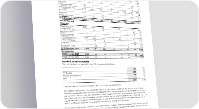 190 ITV plc Annual Report and Accounts 2023 ITV plc Annual Report and Accounts 2023 191 F I NOTES TO THE FINANCIAL STATEMENTS NAN SECTION 3: OPERATING ASSETS AND LIABILITIES CONTINUED C I AL Intangible assets ITV Studios S T Intangible assets can be analysed as follows: The goodwill for ITV Studios has arisen as a result of the acquisition of production businesses since 1999. Significant A T balances were created from the acquisition by Granada of United News and Media’s production businesses in 2000 E M Customer Software and the merger of Granada and Carlton in 2004 to form ITV plc. ITV Studios goodwill also includes the goodwill E Formats contracts and Contractual Libraries licences and N arising from acquisitions since 2012, with the largest acquisitions being Leftfield in 2014, followed by Talpa in 2015 T Goodwill and brands relationships arrangements Licences and other development Total and Plimsoll in 2022. S £m £m £m £m £m £m £m £m Cost At 1 January 2022 3,893 527 441 11 176 104 240 5,392 The key assumptions on which the forecast cash flows for the whole CGU were based (as represented by the approved financial budget for 2024 and forecast to 2026) include revenue (including international revenue and the ITV Studios Additions – – – – – – 44 44 share of ITV output, growth in commissions and hours produced), margins and the pre-tax market discount rate. Acquisitions 107 1 13 – – – – 121 These assumptions have been determined by using a combination of extrapolation of historical trends within the Disposals – – – – – – (5) (5) business, industry estimates and in-house estimates of growth rates in all markets. No impairment was identified. Foreign exchange 37 21 8 – – 2 1 69 At 31 December 2022 4,037 549 462 11 176 106 280 5,621 A pre-tax discount rate of 10.7% (2022: 10.5%) has been used in discounting the projected cash flows. No reasonably possible change in assumptions or discount rate would lead to an impairment. Additions – – – – – – 39 39 Disposals – – (1) – – – (63) (64) Media & Entertainment Foreign exchange (18) (9) (4) – – (1) – (32) The goodwill in this CGU arose as a result of the acquisition of broadcasting businesses since 1999, the largest of At 31 December 2023 4,019 540 457 11 176 105 256 5,564 which was the merger of Carlton and Granada in 2004 to form ITV plc, which was treated as an acquisition of Carlton for accounting purposes. Media & Entertainment goodwill also includes the goodwill arising on acquisition of UTV Amortisation and Limited in February 2016. impairment At 1 January 2022 2,654 460 433 11 129 93 134 3,914 The main assumptions on which the forecast cash flow projections for this CGU are based (as represented by the Charge for the year – 41 6 – 2 – 27 76 approved financial budget for 2024 and forecast to 2026) include: the size, performance and share of the television Reclassifications – – – – – – (5) (5) and streaming advertising market; share of commercial impacts; programme and other costs; and the pre-tax Foreign exchange – 19 7 – – – 1 27 market discount rate. At 31 December 2022 2,654 520 446 11 131 93 157 4,012 In forming its assumptions about the television and streaming advertising market, the Group has used a combination Charge for the year – 17 4 – 2 – 64 87 of long-term trends, industry forecasts and in-house estimates, which place greater emphasis on recent experience. Disposals – – (1) – – – (63) (64) No impairment was identified. Foreign exchange – (8) (4) – – (1) – (13) An impairment charge of £2,309 million was recognised in the Media & Entertainment CGU in 2008, as a result of the At 31 December 2023 2,654 529 445 11 133 92 158 4,022 downturn in the short-term outlook for the advertising market. The current year impairment review, set out above, Net book value results in significant headroom. Even though the advertising market has improved since the impairment was At 31 December 2023 1,365 11 12 – 43 13 98 1,542 recognised in 2008 and the impaired assets are still owned and operated by the Group, due to accounting rules the At 31 December 2022 1,383 29 16 – 45 13 123 1,609 impairment to goodwill cannot be reversed. Goodwill impairment tests A pre-tax discount rate of 10.4% (2022: 10.4%) has been used in discounting the projected cash flows. No reasonably possible change in assumptions or discount rate would lead to an impairment. The carrying amount of goodwill for each CGU is represented as follows: SDN 2023 2022 Goodwill was recognised when the Group acquired SDN (the licence operator for DTT Multiplex A) in 2005. £m £m ITV Studios 903 921 It represented the wider strategic benefits of the acquisition specific to the Group, principally the enhanced ability to promote Freeview as a platform, business relationships with the channels which are on Multiplex A and additional Media & Entertainment 386 386 capacity available from 2010. SDN’s multiplex licence was renewed during 2022 and expires in 2034. SDN 76 76 1,365 1,383 The main assumptions on which the forecast cash flows are based (as represented by the approved financial budget for 2024 and forecast to 2026) are: income to be earned from renewals of medium-term contracts; the market There has been no impairment charge for any CGU during the year (2022: £nil). price of available multiplex video streams; and the pre-tax market discount rate. These assumptions have been determined by using a combination of current contract terms, recent market transactions and in-house estimates When assessing impairment, the recoverable amount of each CGU is based on value in use calculations. These of video stream availability and pricing. No impairment was identified. calculations require the use of estimates, specifically: pre-tax cash flow projections; long-term growth rates; and a pre-tax market discount rate. Cash flow projections are based on the Group’s curren