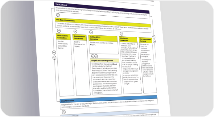 80 ITV plc Annual Report and Accounts 2023 ITV plc Annual Report and Accounts 2023 81 MANAGEMENT BOARD CONTINUED G CORPORATE GOVERNANCE O VE R NAN KYLA MULLINS ADE RAWCLIFFESIMON The wrien responsibilities of the Chair, Senior Independent C General Counsel and Group Director of FARNSWORTH E Company SecretaryDiversity and Chief Technology Director and Chief Executive are available on the ITV plc website: InclusionOfficer www.itvplc.com OUR GOVERNANCE STRUCTURE Appointed: January 2019 Appointed: September 2020 Appointed: January 2024 Experience: Kyla joined ITV as General Counsel Experience: Ade joined ITV as Head of Diversity Experience: Simon joined ITV as Chief Technology and Company Secretary and member of the Commissioning in 2017. She was later promoted to officer and member of the Management Board in Management Board in 2019.Director of Creative Diversity, before taking on the January 2024. He has overall responsibility for role of Group Director of Diversity and Inclusion technology strategy and implementation The PLC Board She has responsibility for legal, company and joining the Management Board in 2020. secretariat, compliance and regulatory matters Prior to joining ITV, he served as News UK’s EVP, Responsible for providing leadership to the Group’s business, including setting the Group’s purpose, strategy and values and promoting its across the ITV Group.Ade has responsibility for all diversity and inclusion Chief Technology Officer and prior to that held key long‑term sustainable success. Prior to joining ITV, Kyla held senior legal positions related matters across the Group, including roles at Discovery Globecast Australia and Telstra in the media, entertainment, strategic outsourcing leading, developing and growing ITV’s Diversity, Broadcast Services. and aviation sectors. She was General Counsel and Equity and Inclusion strategy on and off screen. Company Secretary at easyJet plc and Mitie Group Prior to joining ITV, Ade spent over ten years at PLC Board Committees plc; Global General Counsel of EMI Music; and Channel 4, most recently leading Creative Diversity, The terms of reference for each Committee are documented and agreed by the PLC Board. These terms of reference are reviewed annually Group Legal Director at ITV plc and Granada Media. where she supported and nurtured the careers of and are available on our website: www.itvplc.com/investors/governance/terms‑of‑reference. Kyla is currently Chair of Independent Television diverse creative talent and sought out and News (ITN) and is also a Non-executive Director commissioned a slate of developments which on the Board of Northern Ballet.encouraged diversity, risk-taking and innovation. Ade is currently a Board Member of Independent Nominations Remuneration Audit and Risk Disclosure Our Ambassador Television News (ITN) Trustee of BAFTA, Chair of CommitteeCommittee Committee Committee Network BAFTA’s Learning, Inclusion and Talent Committee, See the See the See the Audit and Risk Committee Consists of the Chair of Discusses and PAUL MOORE and a Trustee of the National Trust.Nominations Remuneration Report. the Board, Chief inputs into Group Committee Report. Executive, Audit and Risk significant Communications Report. Committee Chair, Group proposals and and Corporate CFO & COO, and General initiatives Affairs DirectorMAGNUS BROOKE Counsel and Company impacting our Director of Strategy, Secretary. The Director colleagues. of Investor Relations Policy and Regulation Our designated Duty of Care Operating Board also attends meetings. Workforce The Committee assists Engagement Consisting of key Management Board the Company in meeting Appointed: July 2018 members, including the Chief its disclosure Director reports Executive and the independent Chief obligations, and reviews back to the Board Experience: Paul joined ITV as Group on the Network’s Communications and Corporate Affairs Director Psychological Officer. The Operating and approves regulatory Board oversees the Group’s duty of and other activities and his and a member of the Management Board in 2018. engagement with Appointed: February 2021 care processes on screen and across announcements before He has responsibility for all Group communications ITV, monitors and assesses the publication but post the the Network. including corporate and internal communications, Experience: Magnus joined ITV in 2006 and processes in place to ensure they Board’s approval given public affairs, programme publicity and the Social was promoted to the Management Board in continue to be effective and evolve subject to final agreed Purpose strategy.February 2021. as necessary. The Operating Board changes. Prior to joining ITV, Paul was the Communications He has Board responsibility for ITV’s strategy, meetings are chaired by the Chief and Public Affairs Director at easyJet plc for eight policy and regulatory teams, which includes Executive, and the Audit and Risk years and before this worked for FirstGroup and overseeing ITV’s corporate strategy development Committee Chair attends on behalf Virgin Atlantic Airways where he was Director of and leading on interaction with UK and European of the Board. Corporate Affairs for ten years. Paul first started regulators, government and parliamentary his career as a civil servant and worked for the committees. Department of Transport. Chief Executive From 2014 to 2019 Magnus was Chairman of the Board of the Brussels based Association of Responsible for the day‑to‑day running of the Group’s business and performance, the development and implementation of strategy and Commercial Television in Europe, which represents promoting our culture and standards. Europe’s commercial broadcasters to the EU institutions. Magnus is a Director and Chair of the Remuneration Committee of Everyone TV (formerly DUK) which runs the Freeview and Management Board Freesat platforms and he was a Non-executive Led by the Chief Executive, the Manag